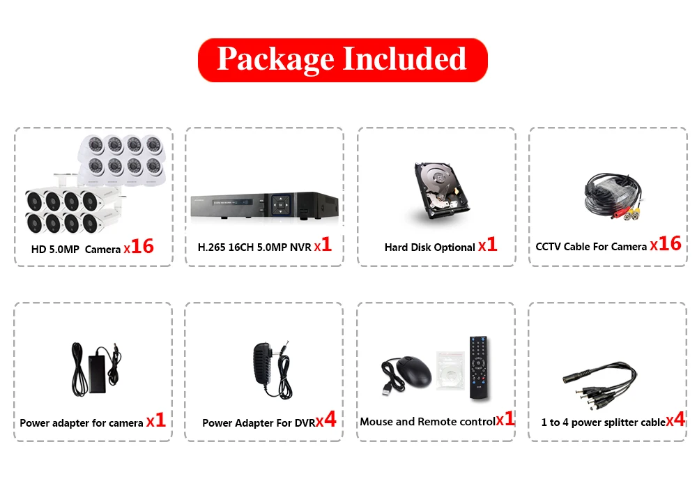5mp 16CH Video Surveillance System with 16pcs 5.0MP Night Vision Outdoor/Indoor Home Security Camer